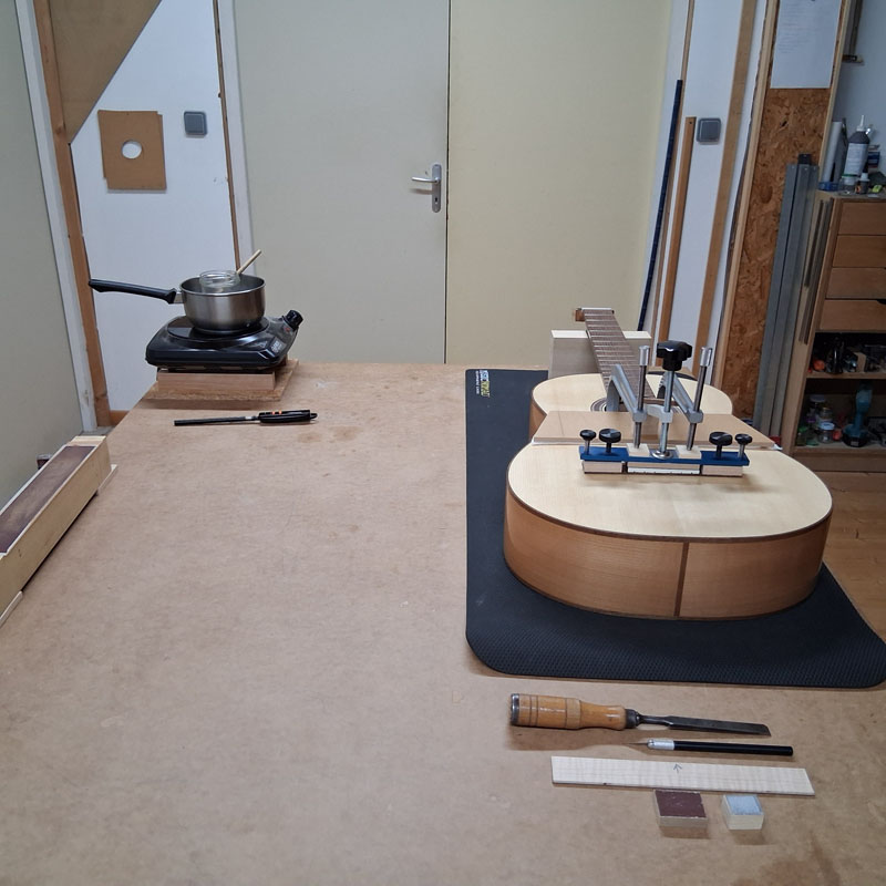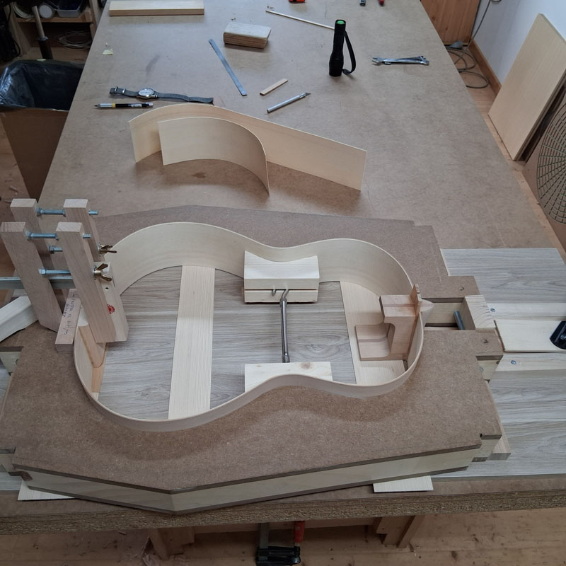 Les éclisses, le manche et tasseau arrière sont collés dans un moule extérieur.