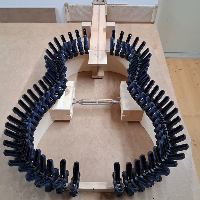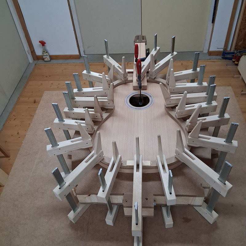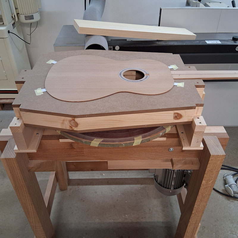 Ensuite, je colle les contre-éclisses de table et après usinage manuel de la géométrie du pourtour la table est collée.